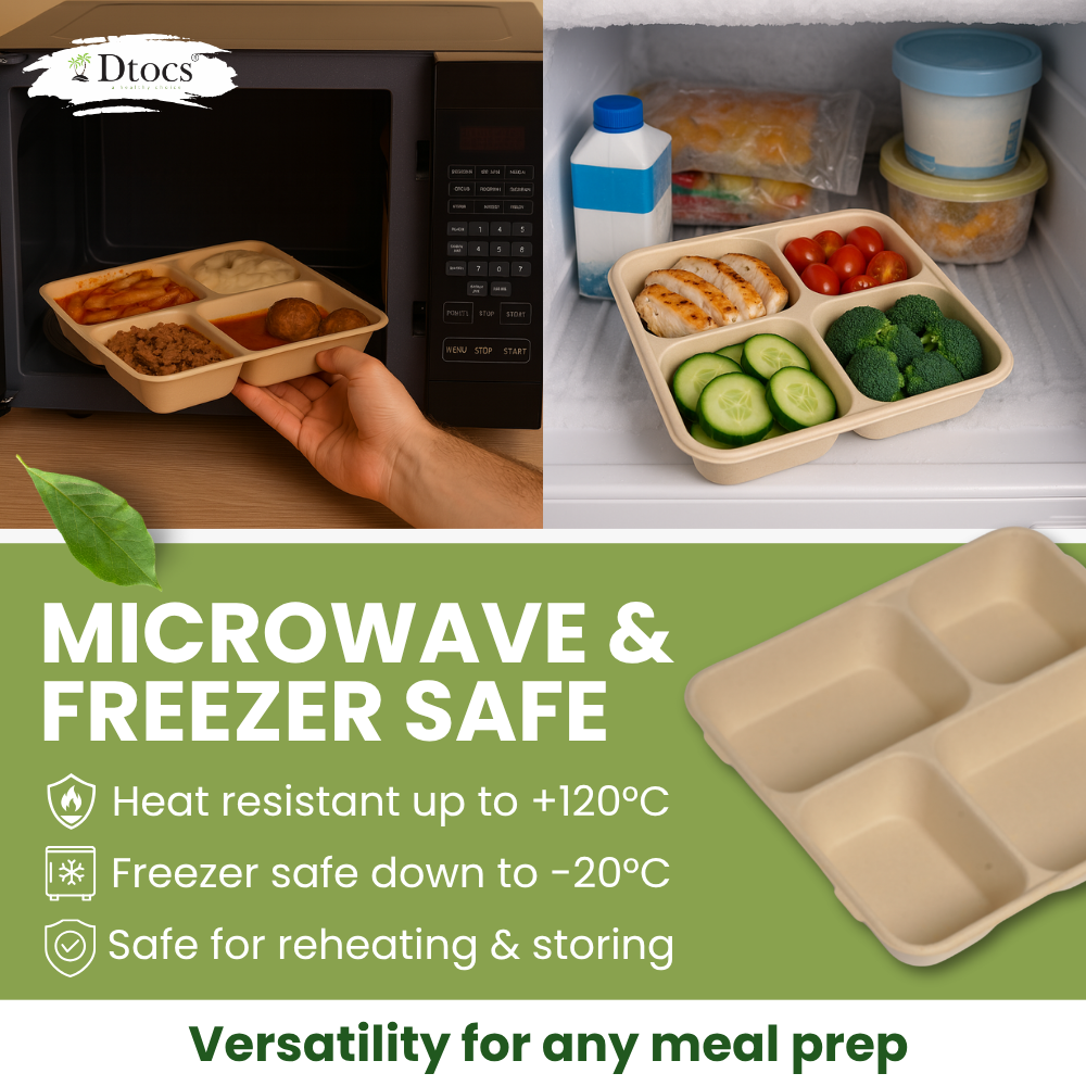 - Heavy-Duty & Microwavable Plates: These lunch trays are built to handle hot, cold, oily, or saucy foods without leaking or bending. Dtocs disposable plates are microwavable and freezable (up to +120°C / down to -20°C), making them versatile as to go plates, lunch trays, or dinner plates.