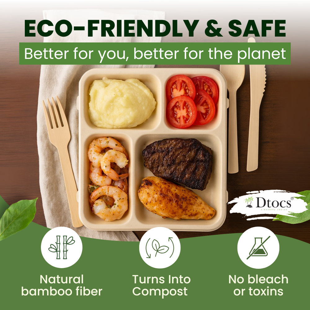 - Heavy Duty, Durable Sectional Plates: These compartment trays are crafted from bamboo fiber and tapioca starch - without bleach or toxic chemicals that gives it durability. Making them a better alternative to paper trays, plastic plates, and a sustainable alternative to wooden divider plates. Perfect for any party, wedding, or occasion.