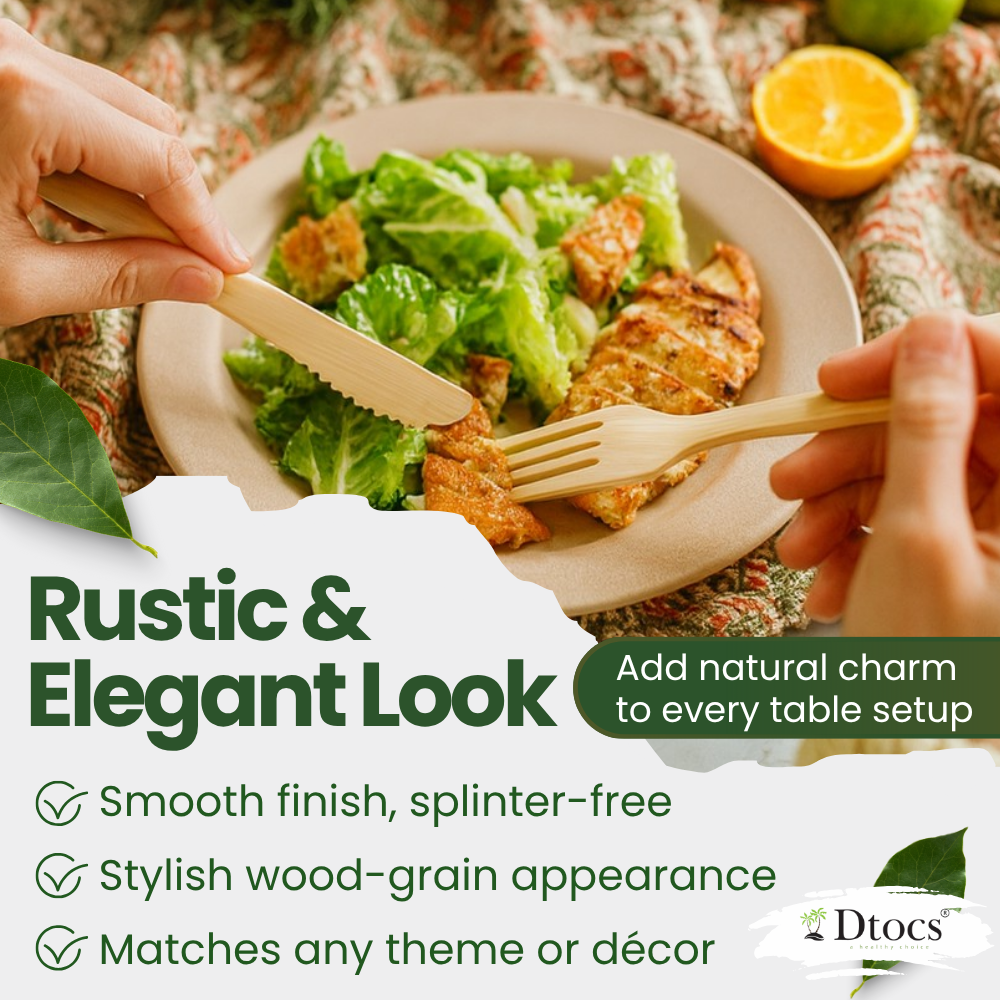 - Elegant Wood Look Tableware: These forks, spoons, and knives are made from smooth birchwood that offers a natural rustic look without any chemicals or toxins. Dtocs disposable cutlery is perfect for creating charming tablescapes at parties, outdoor gatherings, or for any small, big occasion without cleaning 100s of silverware sets.