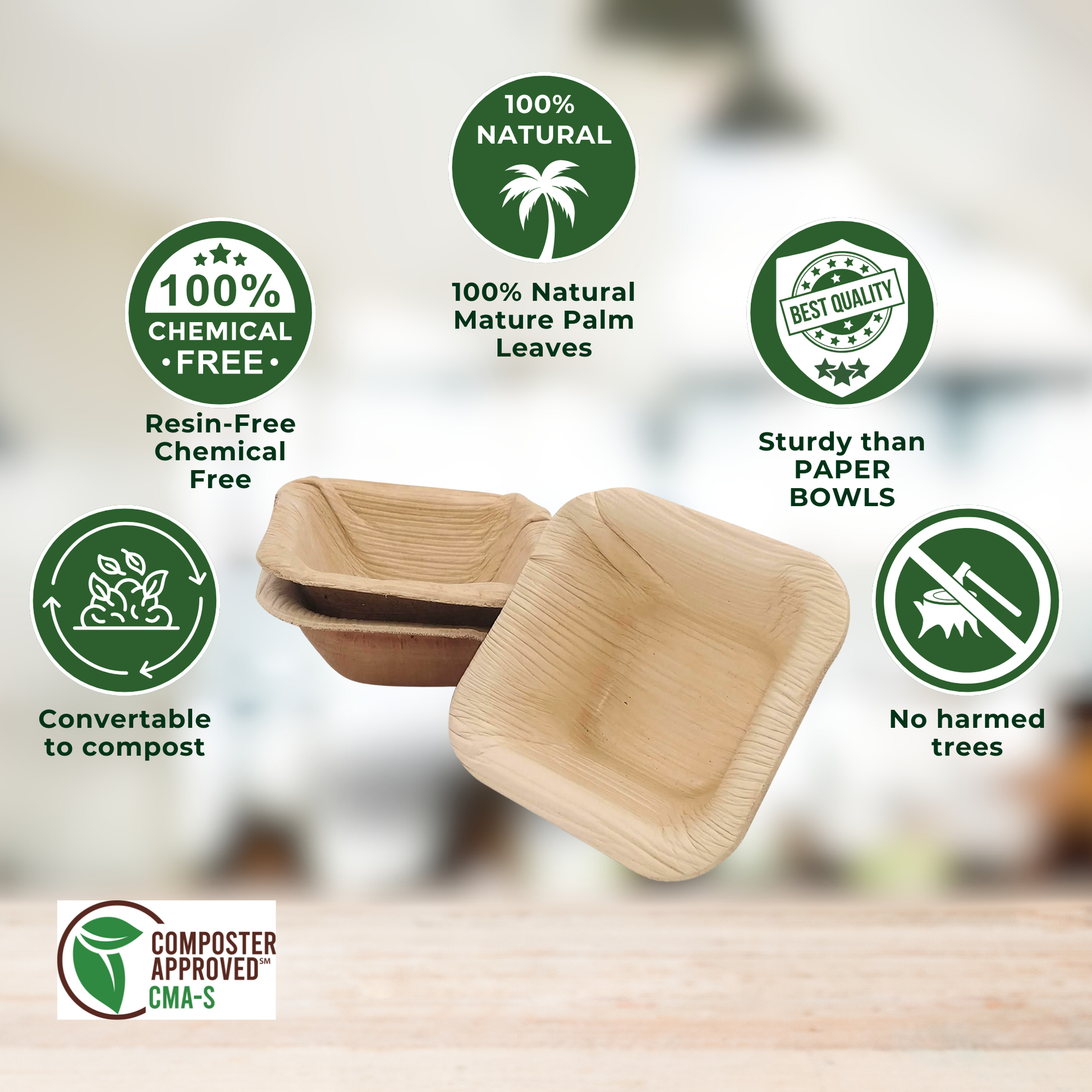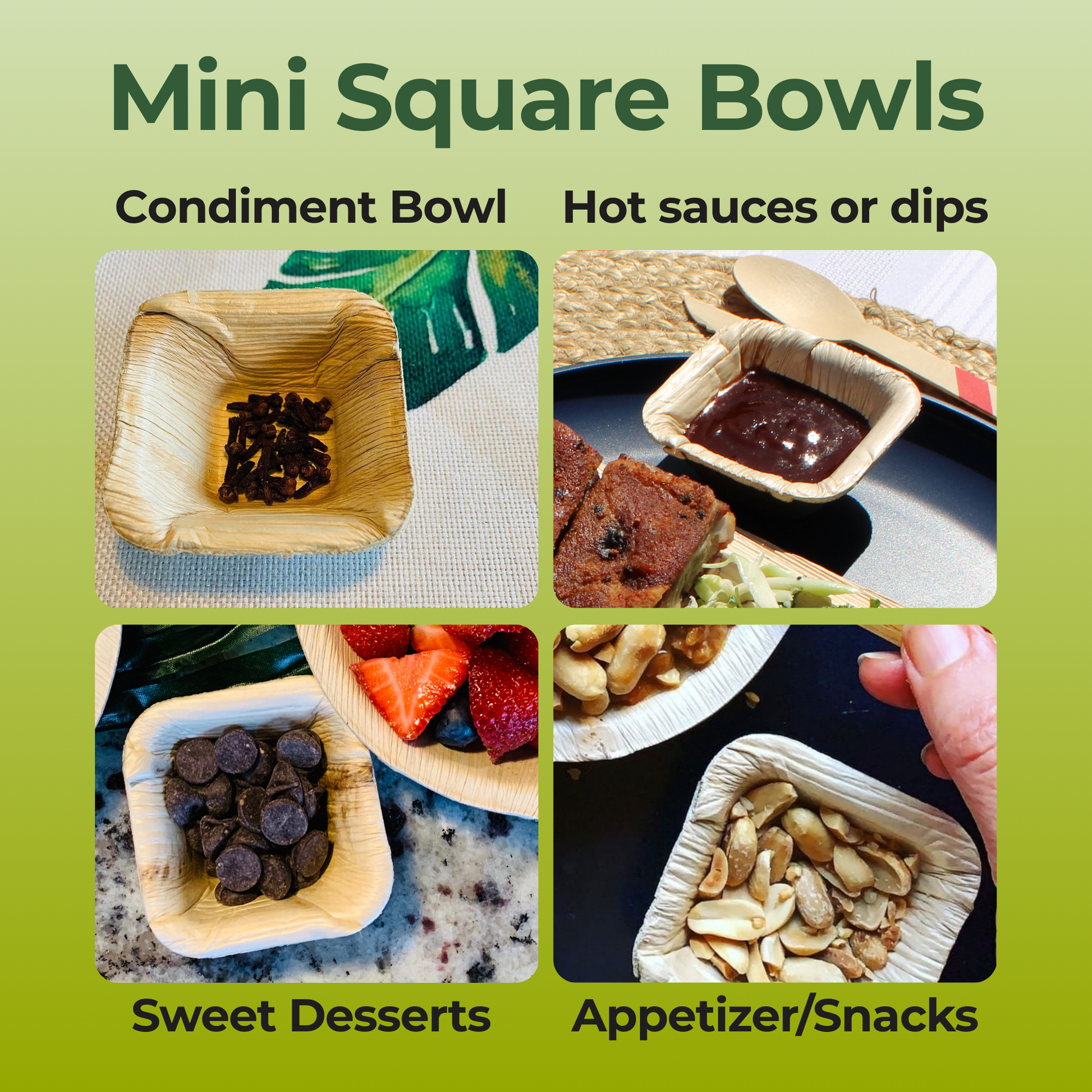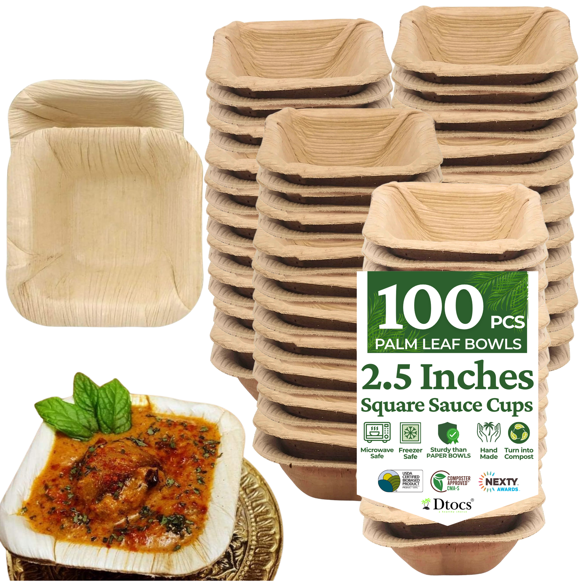 Dtocs 2.5 inch square disposable bowls are hand crafted from palm leaves that have fully matured hence, 100% compostable bowls. This disposable dinnerware set includes 100 pieces of square bowls which resemble wooden bowls, bamboo bowls. Each disposable dip bowl has it's own texture and natural aroma. These rustic eco-friendly bowls are stylish and sturdier than available disposable paper bowls and are perfect to be used as single serve dessert bowl, dipping bowl, tasting cups, condiment bowl etc. These bowls are greatly used in wedding receptions, food trucks, camping, and restaurants.