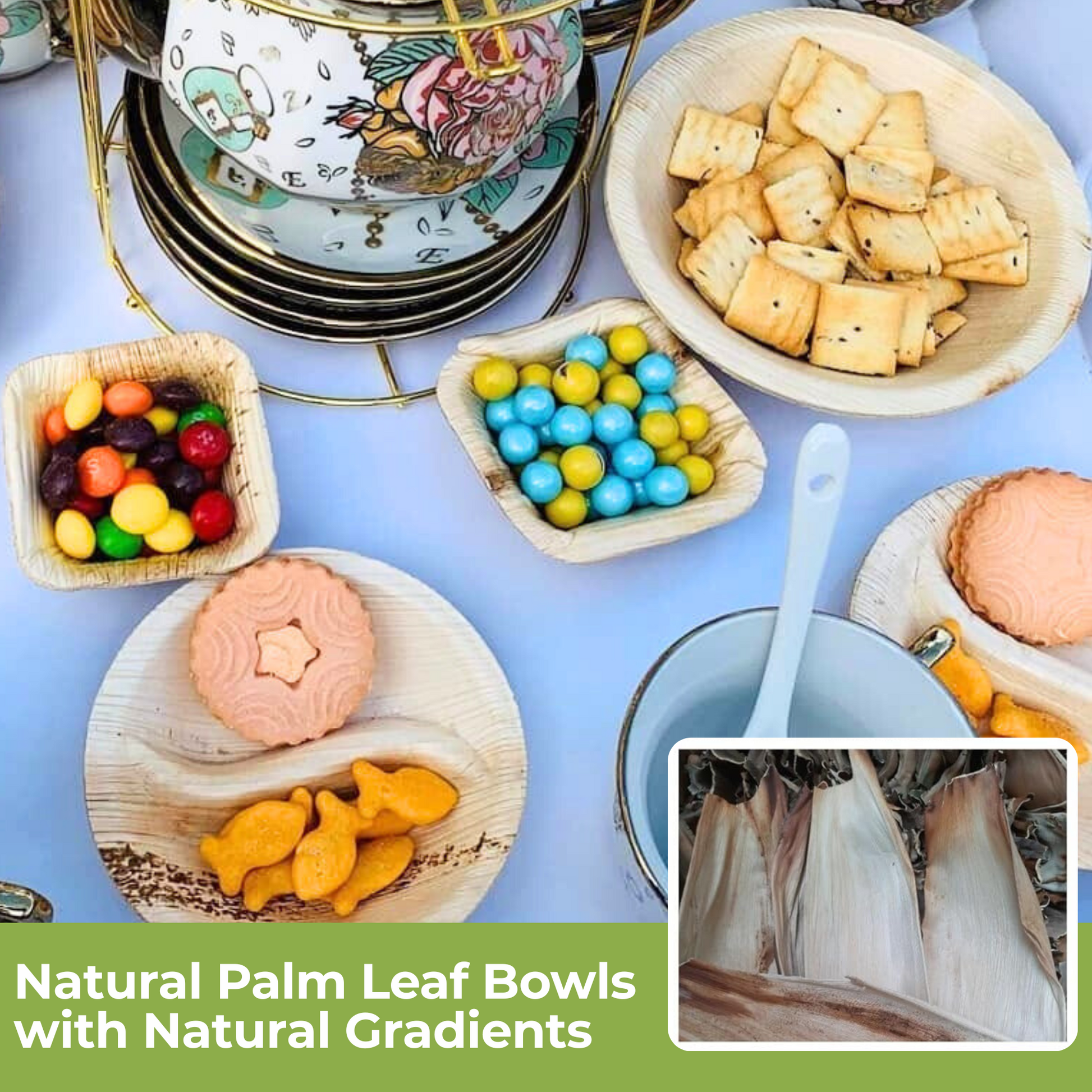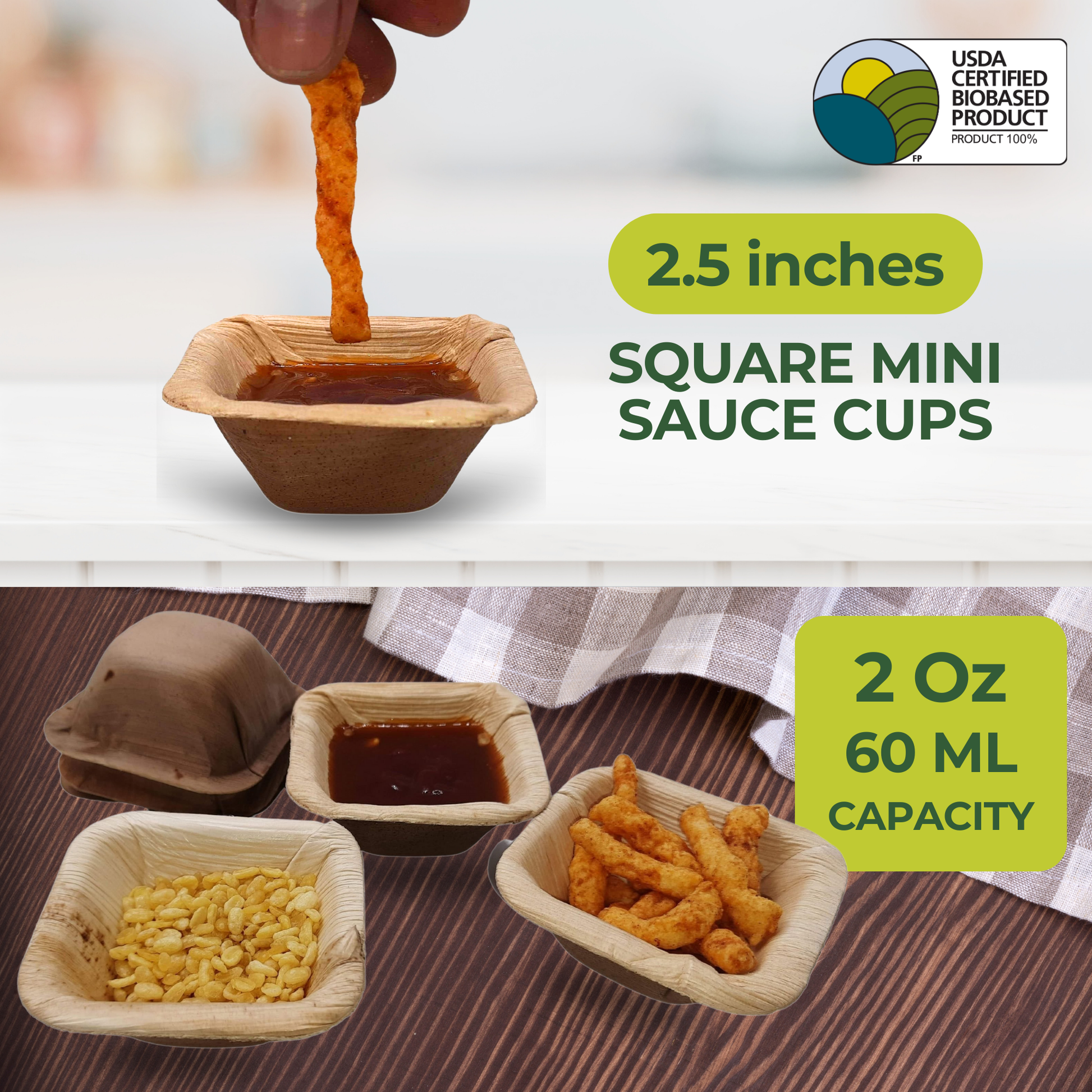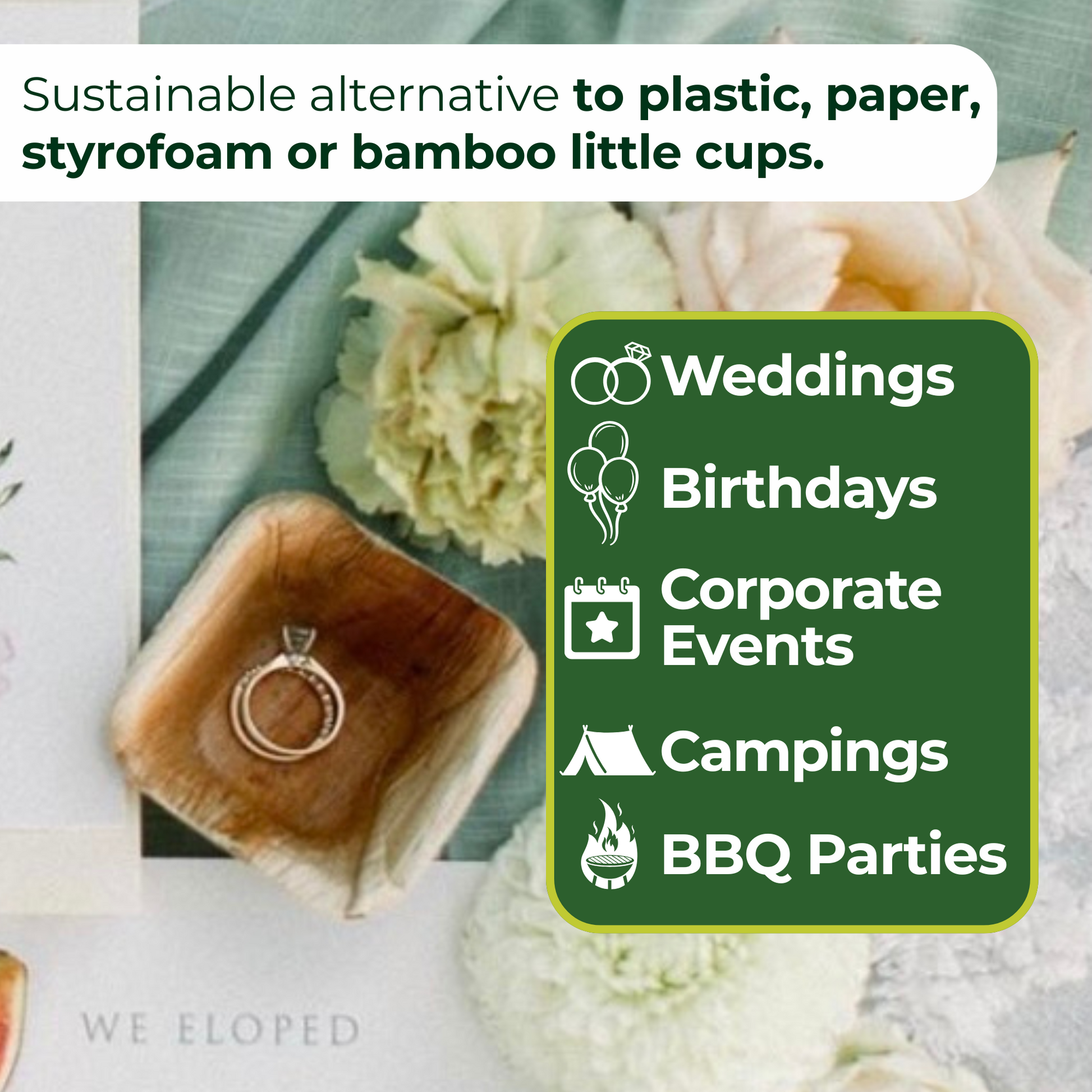 Dtocs 2.5 inch square disposable bowls are hand crafted from palm leaves that have fully matured hence, 100% compostable bowls. This disposable dinnerware set includes 100 pieces of square bowls which resemble wooden bowls, bamboo bowls. Each disposable dip bowl has it's own texture and natural aroma. These rustic eco-friendly bowls are stylish and sturdier than available disposable paper bowls and are perfect to be used as single serve dessert bowl, dipping bowl, tasting cups, condiment bowl etc. These bowls are greatly used in wedding receptions, food trucks, camping, and restaurants.