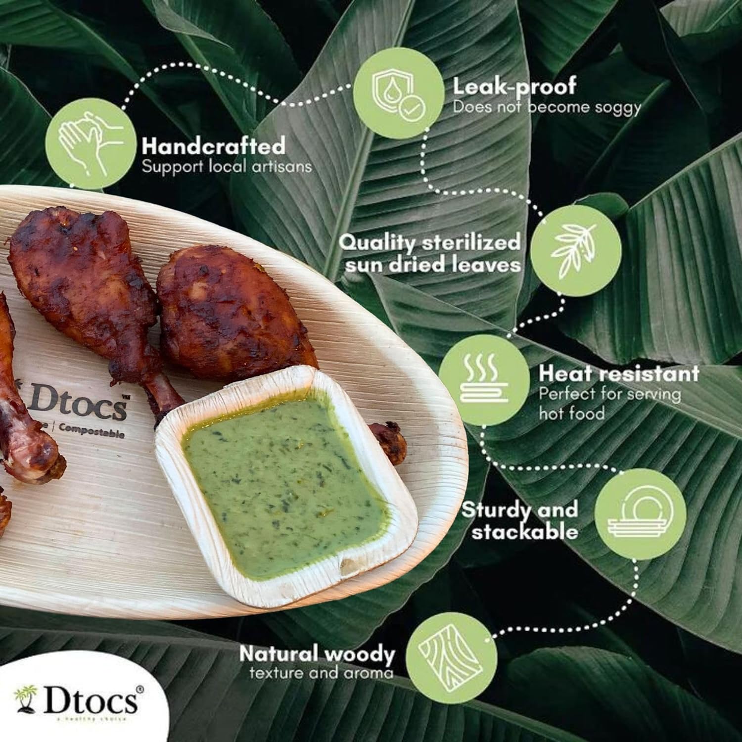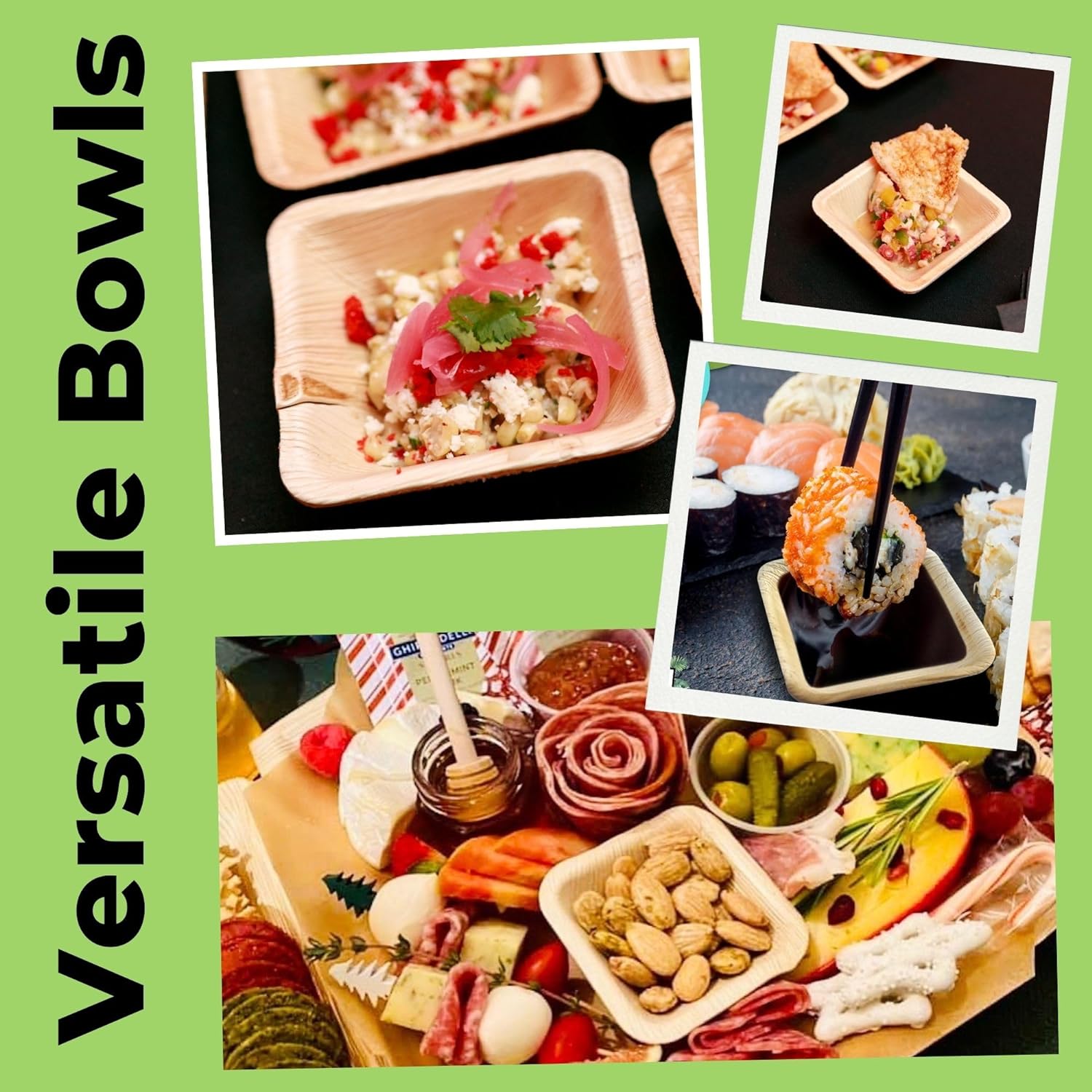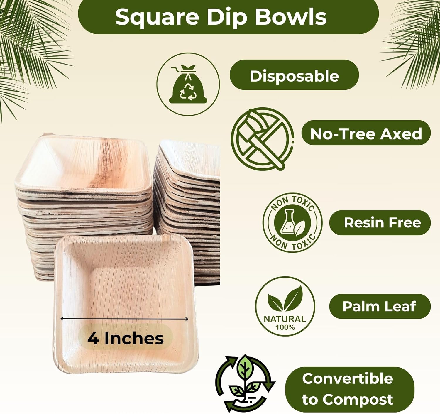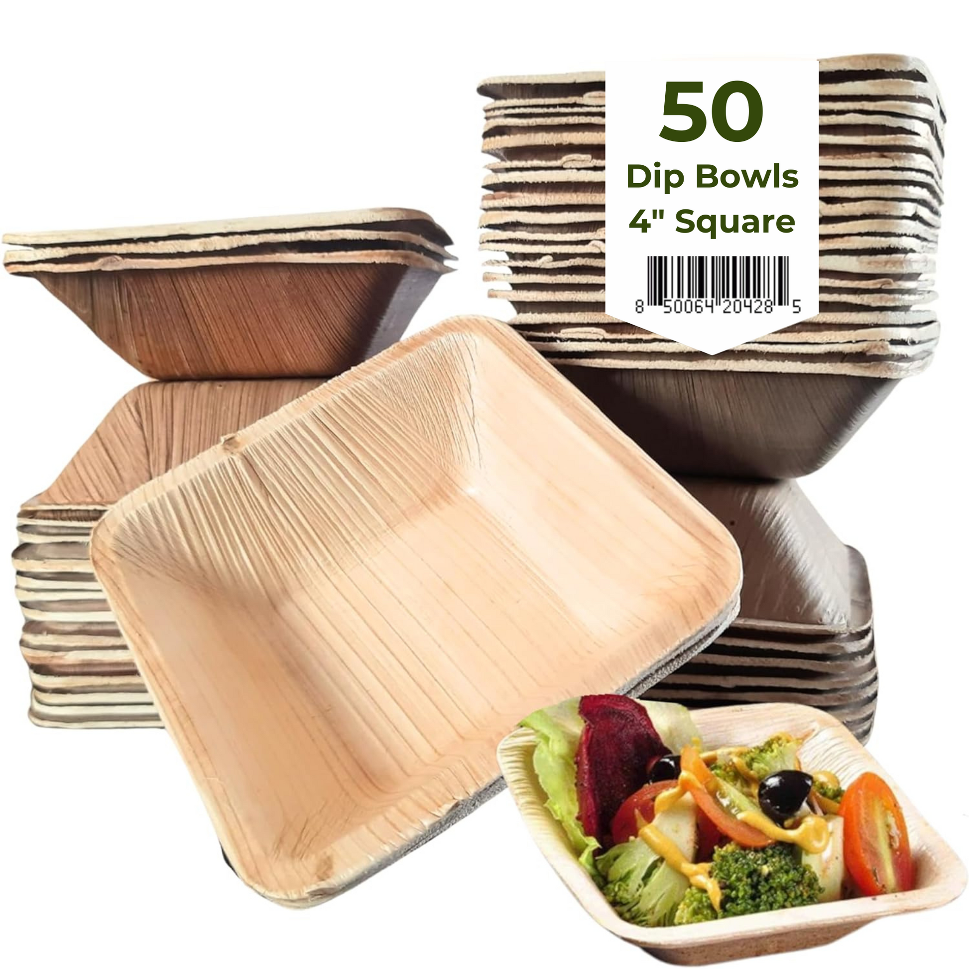 Dtocs 4 inch square disposable bowls are handcrafted from fully matured palm leaves hence, 100% compostable bowls. This disposable dinnerware set includes 50 pieces of square bowls which resemble wooden bowls, bamboo bowls. Each disposable soup bowl has it's own texture and natural aroma. These rustic eco-friendly bowls are stylish and sturdier than available disposable paper bowls and are perfect to be used as soup bowls, cereal bowls, fruit bowls etc. Because of the strength and capacity (500 ml/18 Oz), these bowls are greatly used in wedding receptions, food trucks, camping, and restaurants.