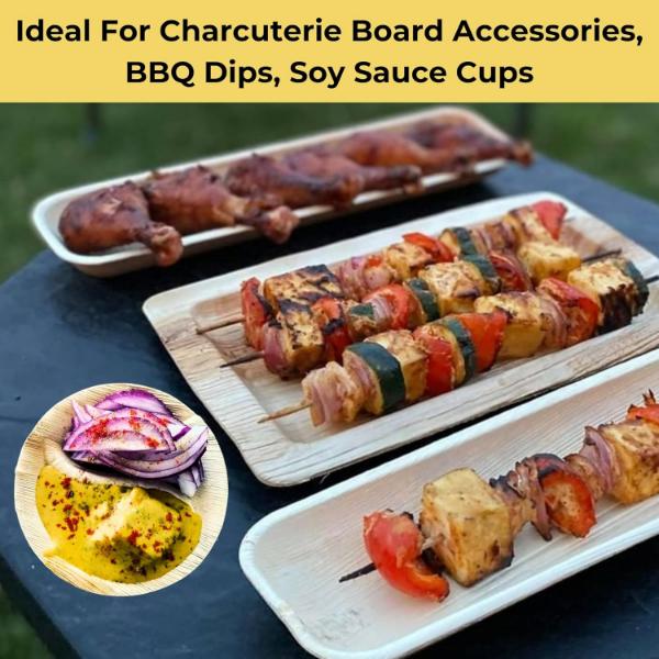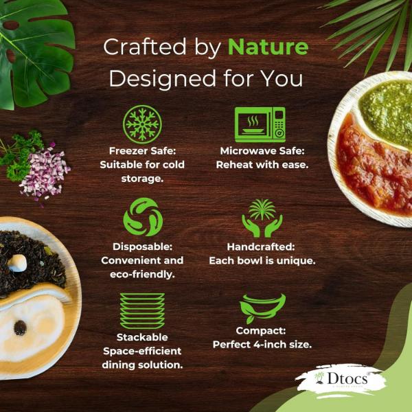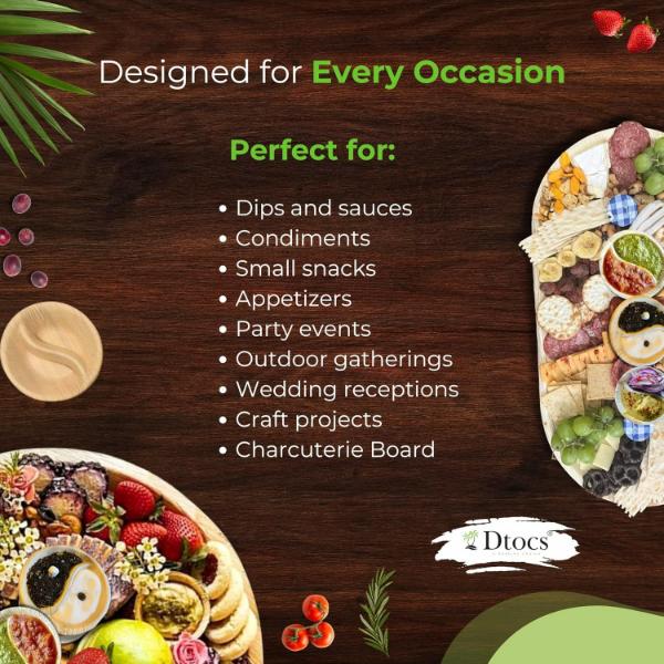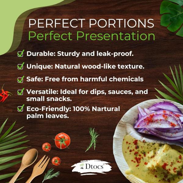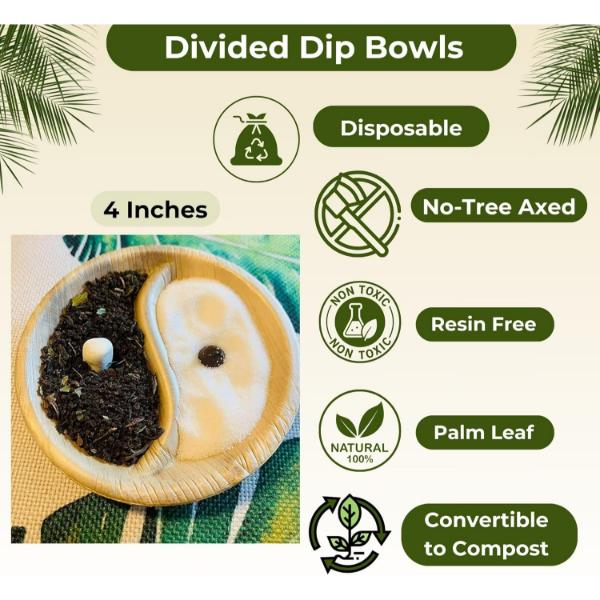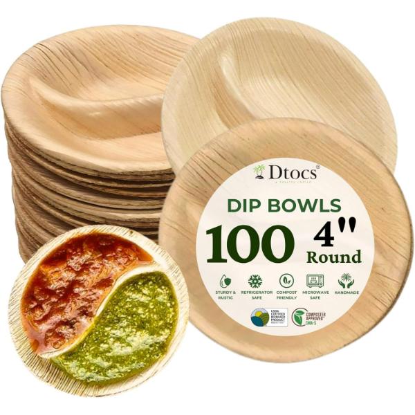Dtocs 4 inch round compartment disposable bowls are handcrafted from fully matured palm leaves hence, 100% compostable bowls. This disposable dinnerware set includes 100 pieces of round bowls with 2 portion which resemble wooden bowls, bamboo bowls. Each disposable dip bowl has it's own texture and natural aroma. These rustic eco-friendly bowls are stylish and sturdier than available disposable paper bowls and are perfect to be used as condiment bowls, dip bowls, sauce bowls etc. Because of the strength and capacity these bowls are greatly used in wedding receptions, food trucks, camping, and restaurants.