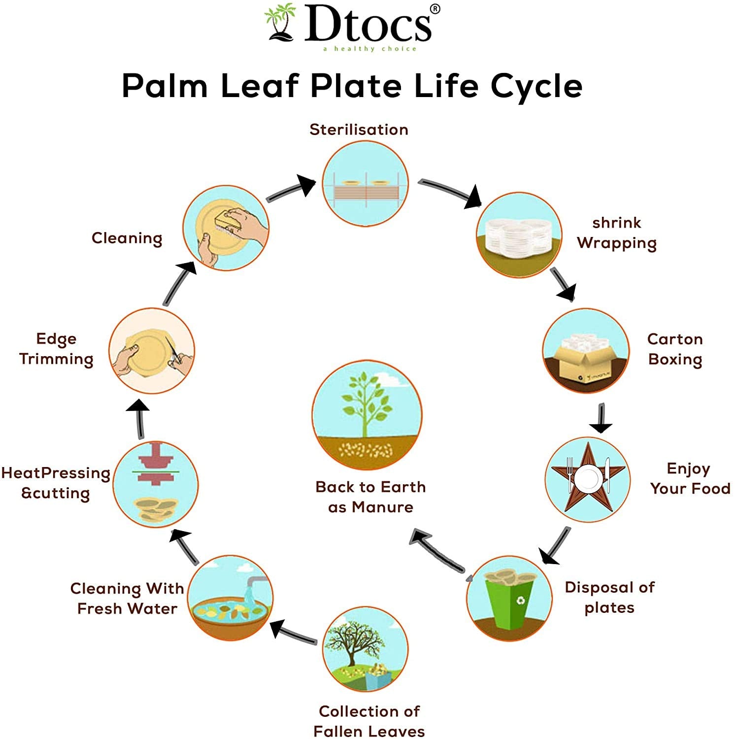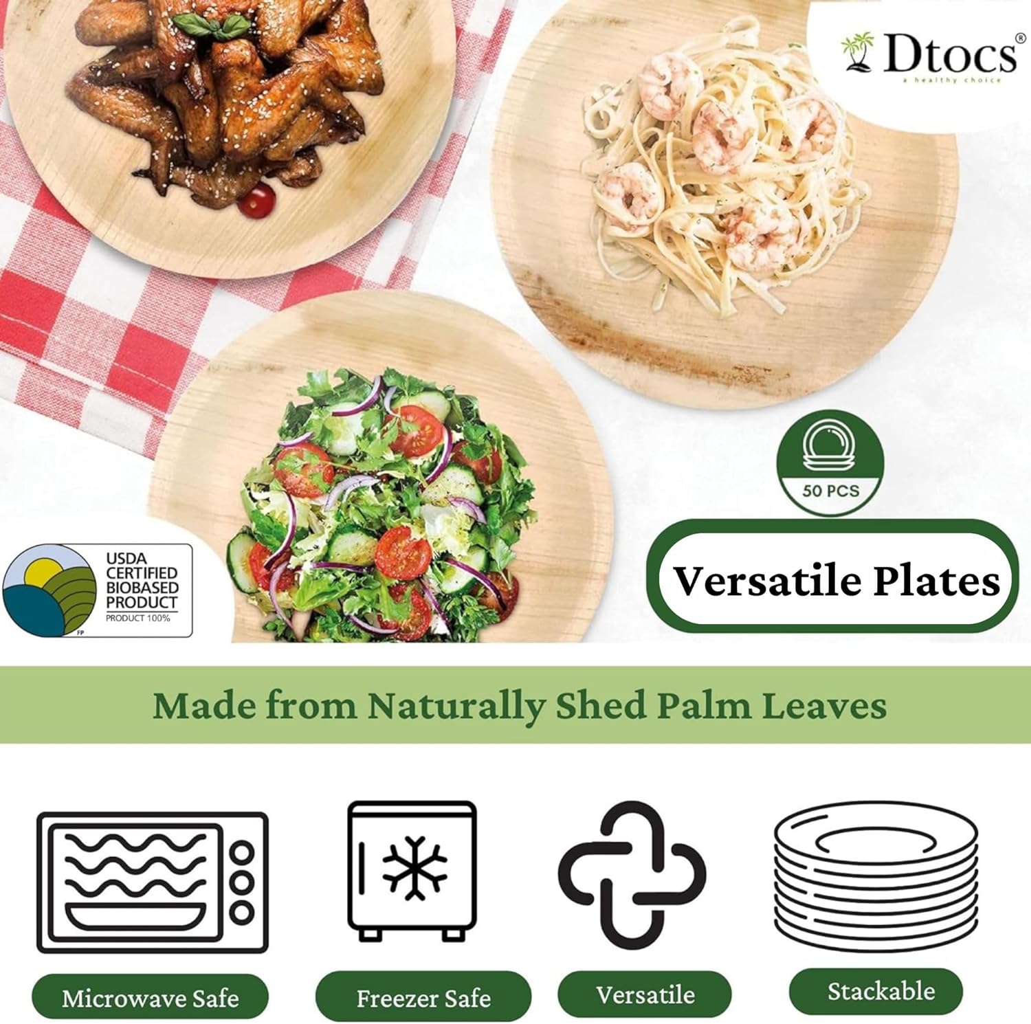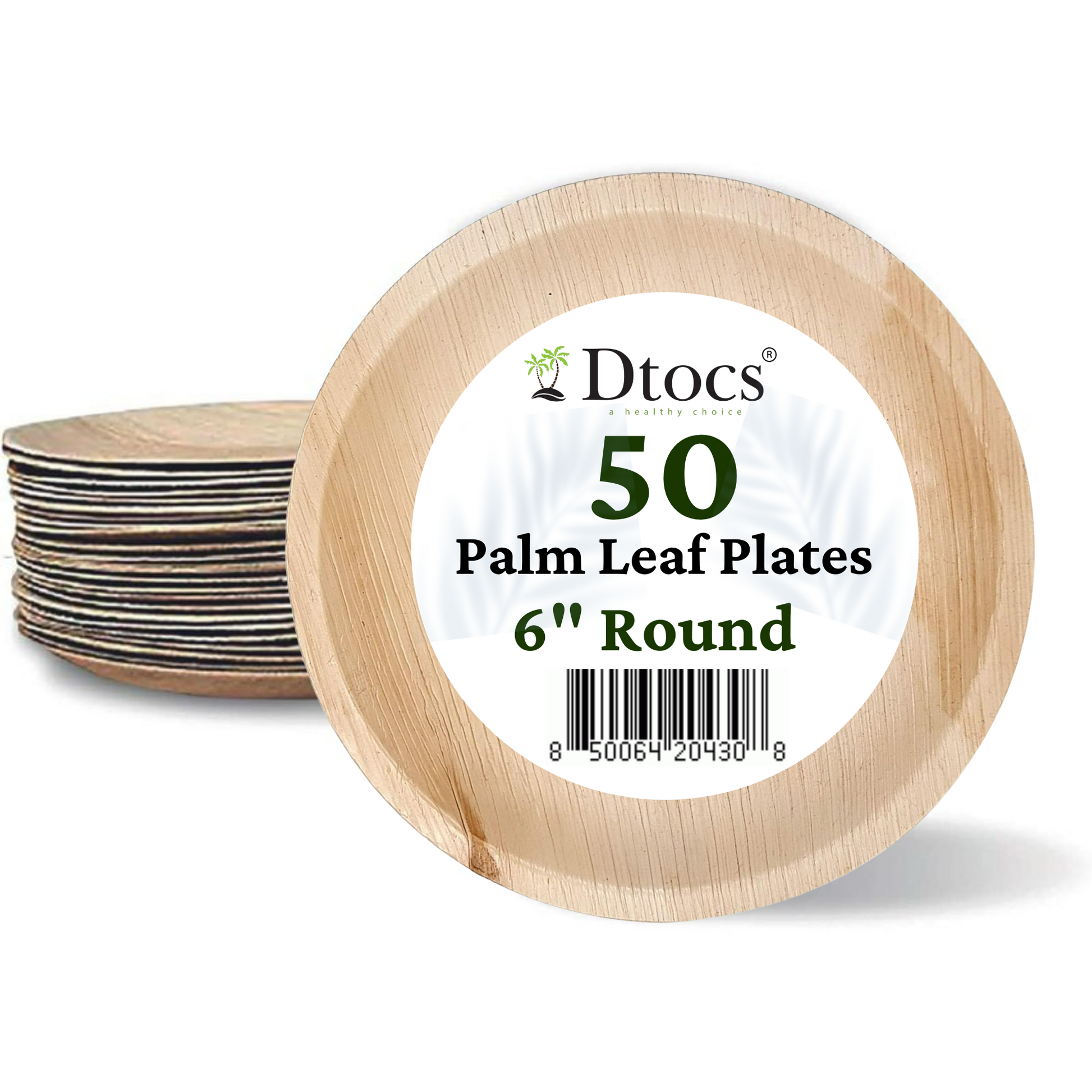 Dtocs 6 inch round dessert plates, appetizer plates, salad plates are handcrafted from palm leaves that have fully matured hence 100% compostable plates. This dinnerware set includes 50 pieces of round plates which resemble wooden plates, bamboo plates. Each party plate has it's own texture and natural aroma. These rustic eco-friendly plates are stylish and sturdier than available disposable plates like paper plates, bagasse plates, clear plastic plates and are perfect for catering supplies, wedding reception, weekend parties, BBQ.