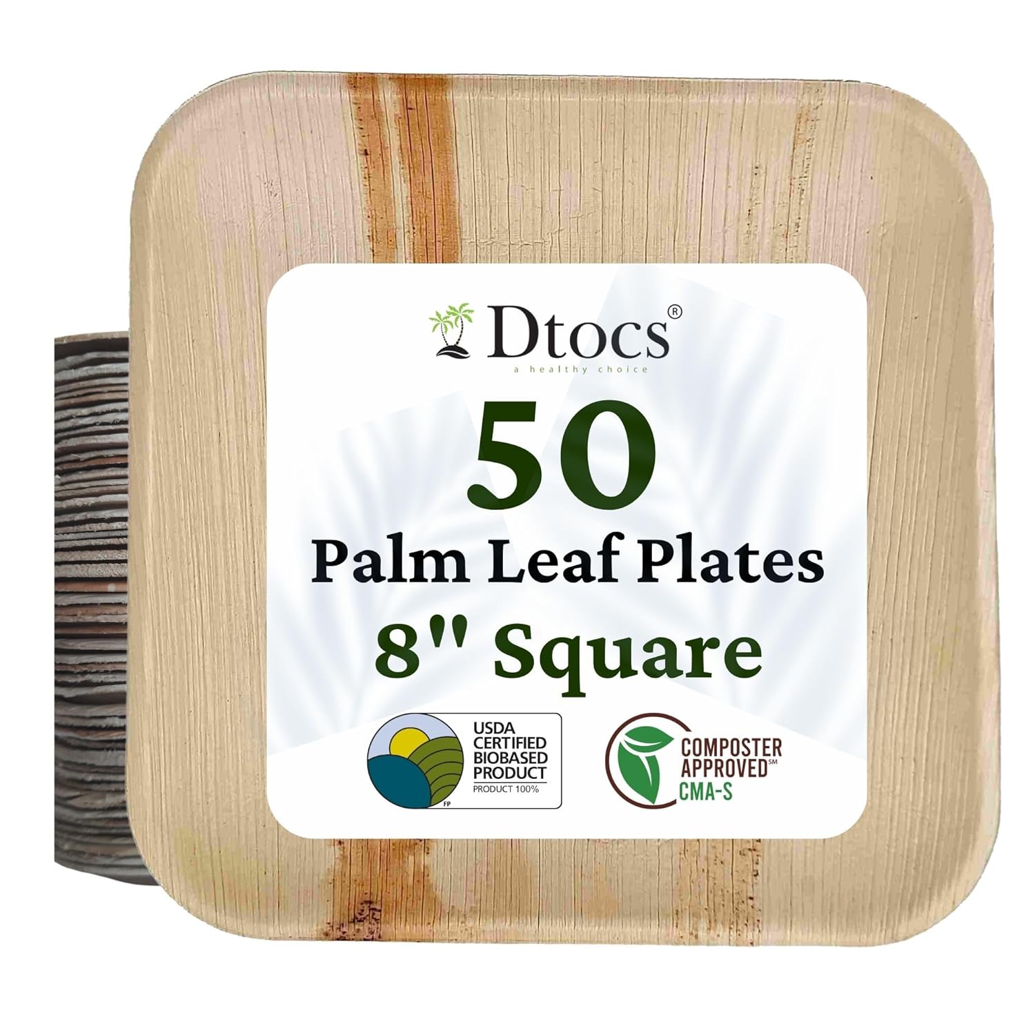 Dtocs 8 inch square plates are handcrafted from palm leaves that have fully matured, hence 100% compostable plates. This dinnerware set includes 50 pieces of square plates which resemble wooden plates, bamboo plates. Each party plate has it's own texture and natural aroma. These premium eco-friendly plates are stylish and sturdier than available disposable paper plates and are perfect for serving mini meals, breads, snacks, BBQ during wedding reception, weekend parties, amusement parks etc.